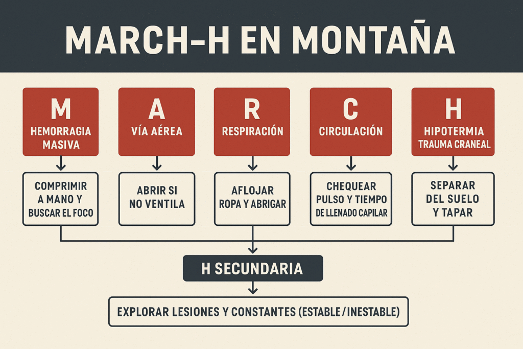 Primeros auxilios | Hemorragias, hipotermia, RCP | MARCH-H, AVDI, protocolos de trauma en montaña |