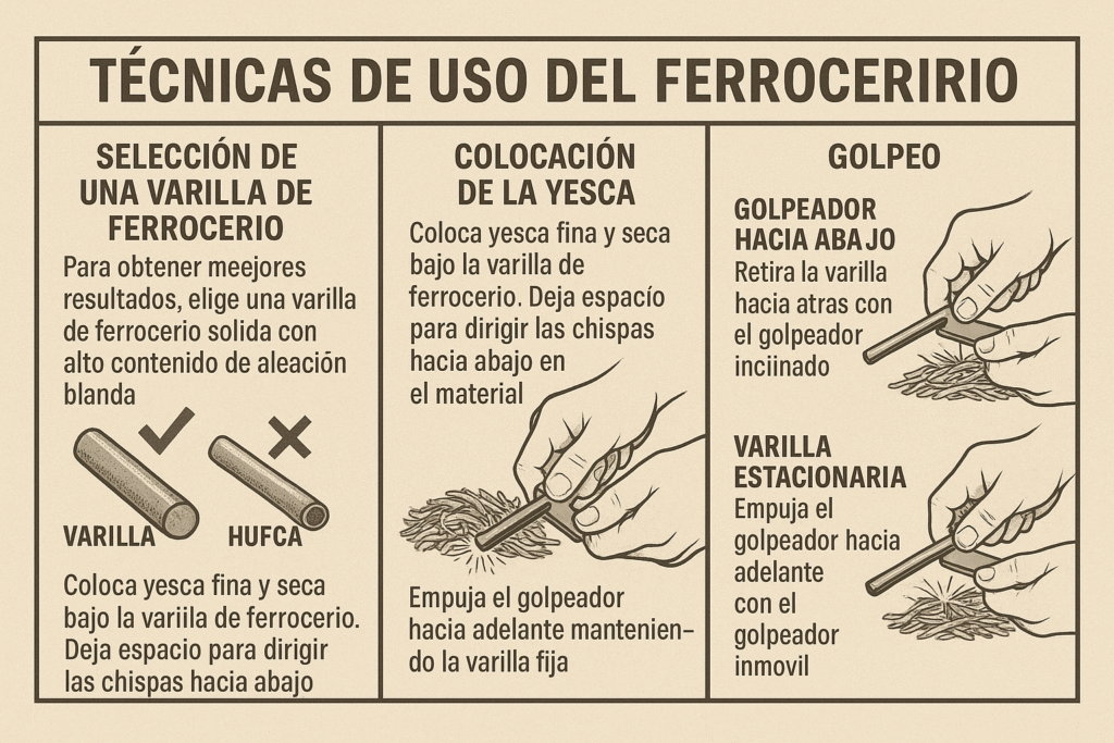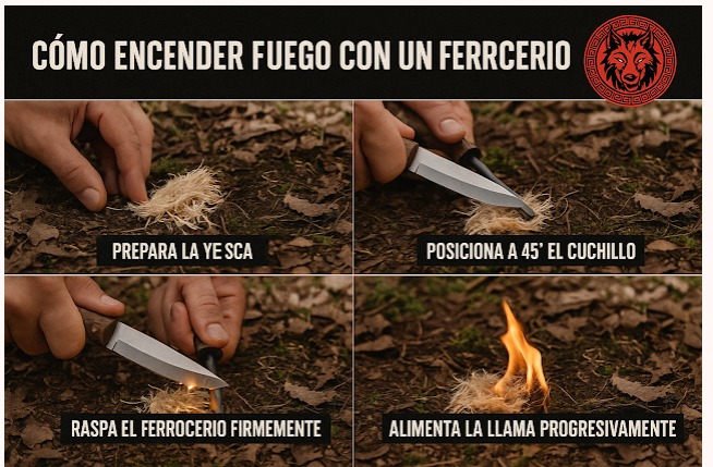 👉En esta sección les presentamos dos diagramas sobre cómo usar correctamente el ferrocerio. Nunca debes rasguñarte con el filo del cuchillo; si el lomo de este tiene canto vivo, bastará. Recomendamos el Wildo Pro, un producto de confianza y durabilidad. Si tu ferrocerio cuenta con una lámina de acero con escaso canto, tienes la posibilidad de mejorarlo con una lima de hierro hasta mantenerlo operativo. Es importante recordar que el ferrocerio es una extensión de tu mano; su dominio puede ser el factor determinante entre iniciar fuego a la primera o no tener éxito en una situación de crisis.