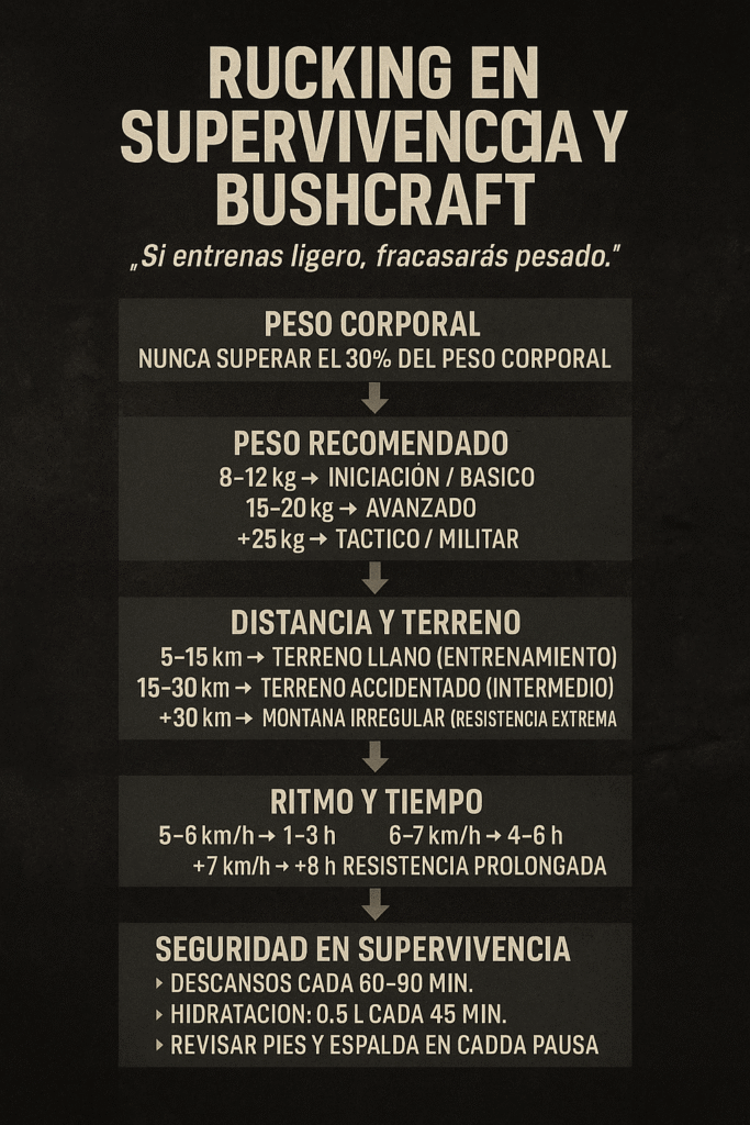 - En el ámbito de la supervivencia y el Bushcraft, el rucking es un acto natural: llevar una mochila, recorrer grandes distancias, mantener energía y administrar recursos. La práctica de rucking en la cotidianidad implica estar más preparado para afrontar situaciones auténticas en los entornos naturales.